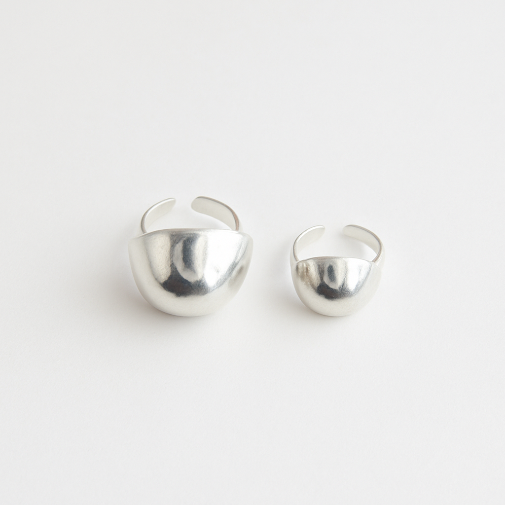 Nuestro Anillo Circular Protagonista presenta una silueta redonda y llamativa que atrae todas las miradas con su diseño limpio y escultural. Disponible en dos tamaños—Medium para un toque refinado del día a día y Maxi para un look verdaderamente impactante—esta pieza te permite elegir tu nivel de audacia.